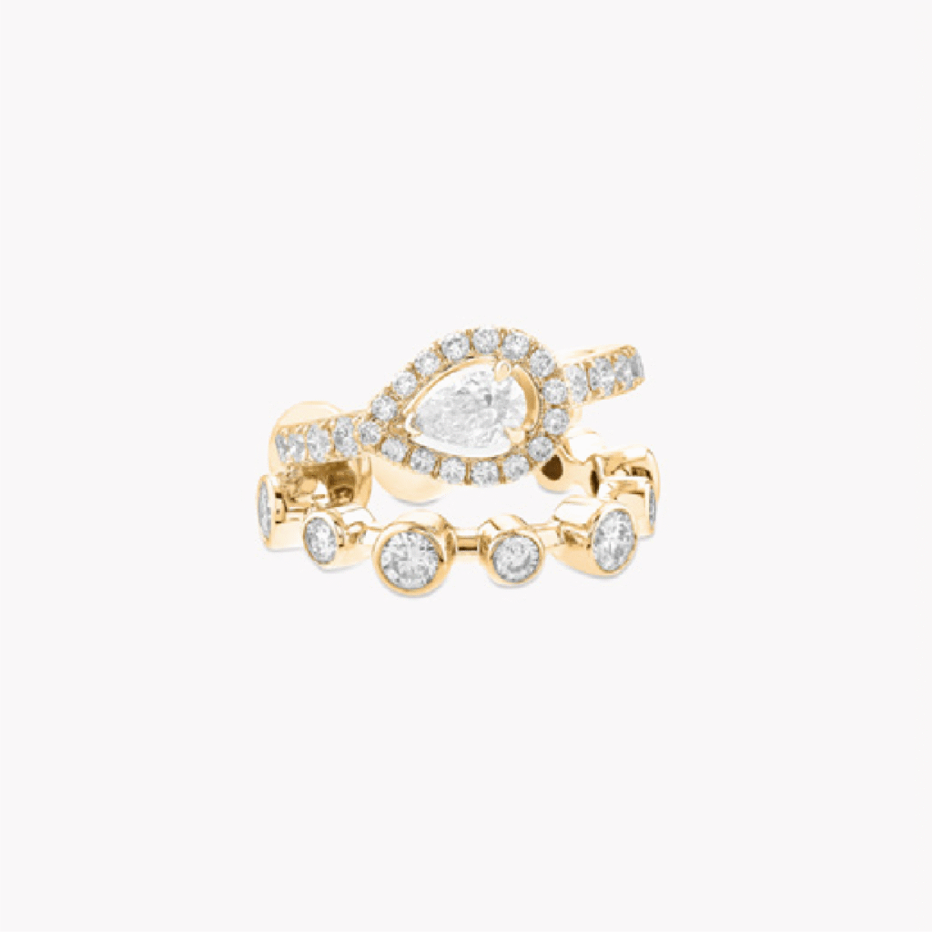 Dualité Signature Ring crafted in 18K gold and set with round brilliant diamonds and a central pear shape diamond.
